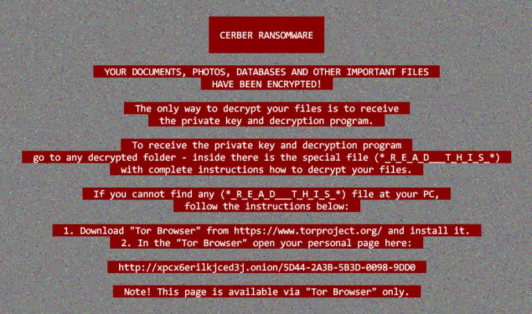 Cerber employs into a system a Trojan virus. The virus scans your system and then encrypts more than 500 file types, converting them into a .cerber or other random extension. The moment all files are encrypted, the screen meets you with a message about ransom demands and instructions. The ransom hackers ask is usually $500 in Bitcoin.