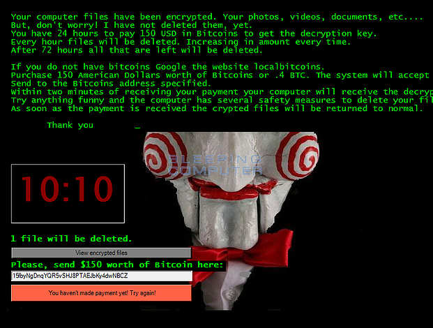 Jigsaw encrypts more than 200 file types. After downloading the malware, a user has 24 hours to pay $150 before ransomware starts deleting their files. The files are deleted progressively: the amount of deleted files increases every hour. If the user reboots their computer, the ransomware automatically deletes 1000 files.