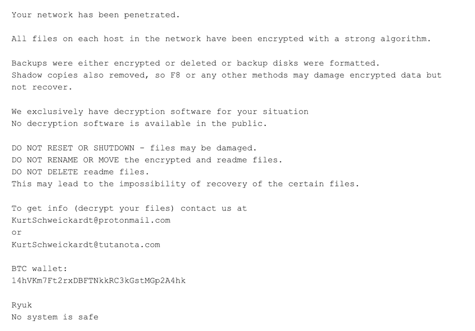 When infiltrating the system, Ryuk converts non-executable files in the .ryk file extension. Then it drops a notification with ransom demands and guidelines in the folders that have been processed and names them RyukReadMe (.html or .txt). The ransom demand is insane: from 15 to 50 Bitcoins.