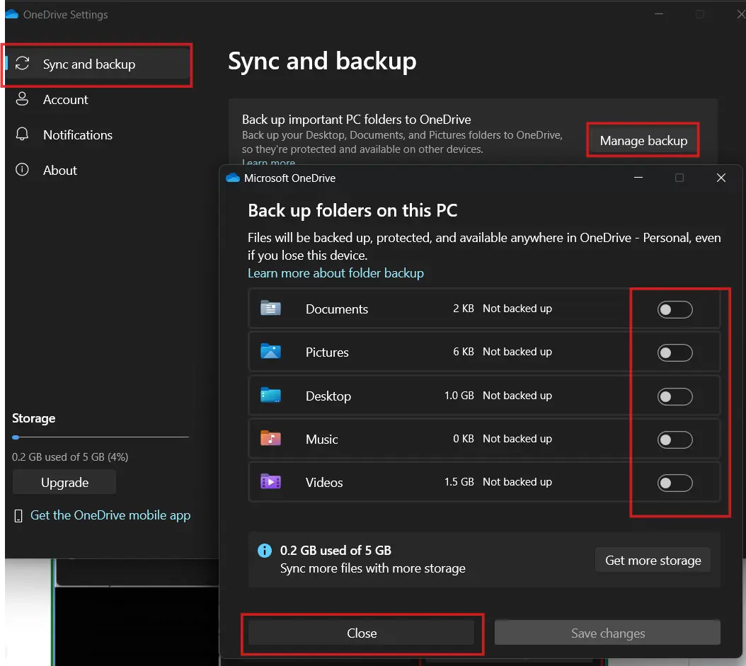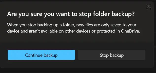 1. You might see a pop-up asking for confirmation. Click “Stop backup” and click “Close”. This will disable automatic sync.
