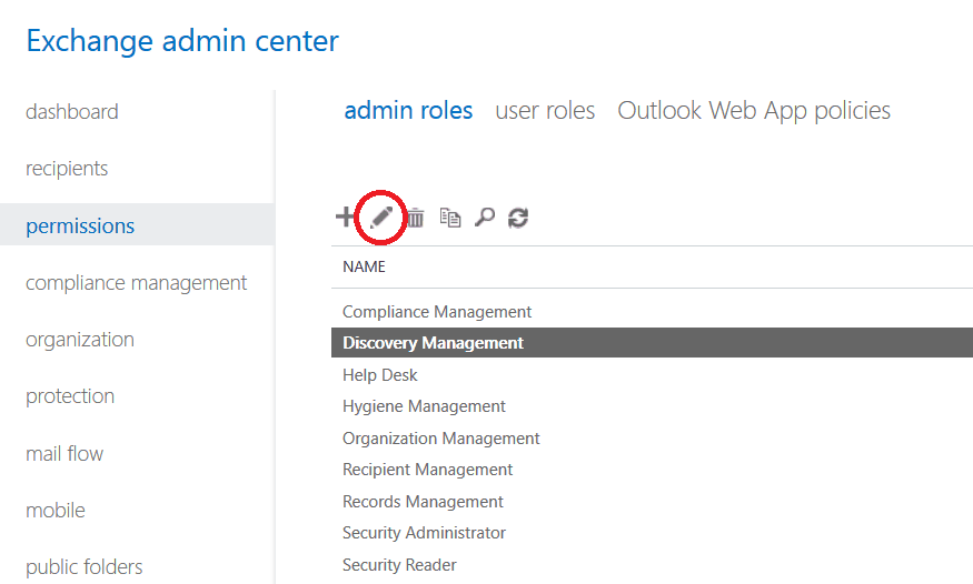 4. Ensure the Admin Roles panel is selected. Select Discovery Management and click Edit.