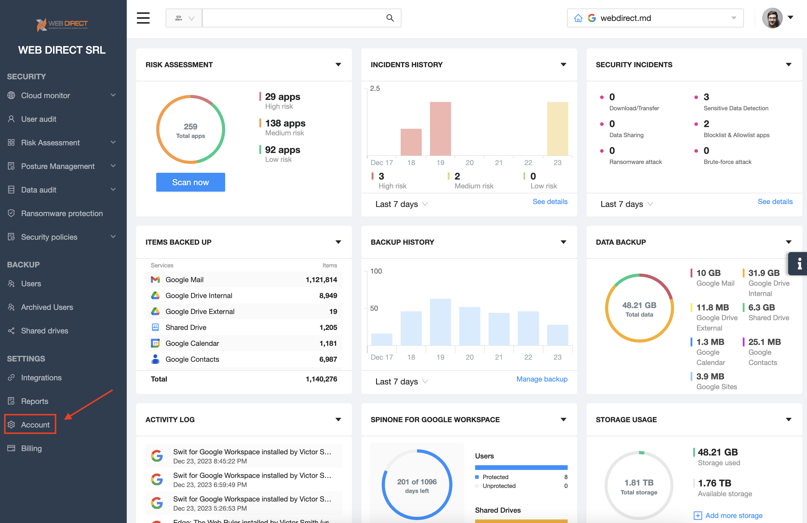 Please login to your SpinOne account. Once you have logged in, click the Account button that is located on the left panel.