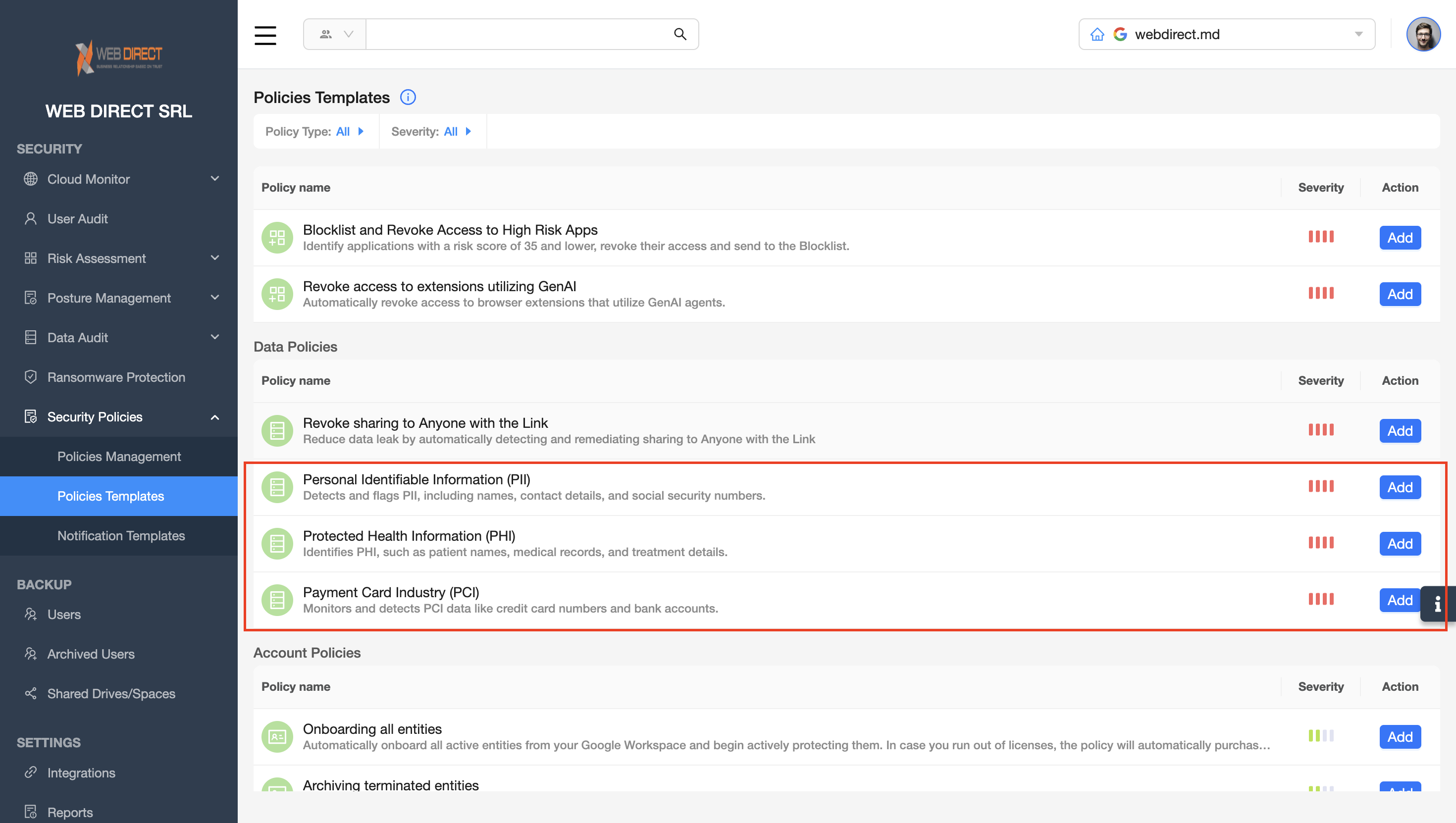 To assist you in utilizing our DLP policies, we have gone ahead and created policy templates that you can modify and easily add to your SpinOne platform. The newest SpinDLP policies are preconfigured to address detection and remediation of PII, PHI and PCI data.