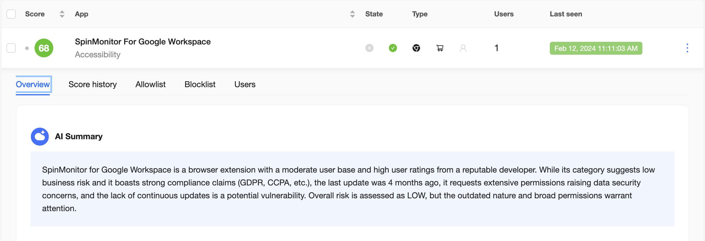 For Google Workspace™ & Microsoft 365, we have expanded our Risk Assessment capabilities by way of utilizing AI to summarize risk associated to Extensions and Applications. This summary is based on the 20+ factors used to determine Risk and Exposure.