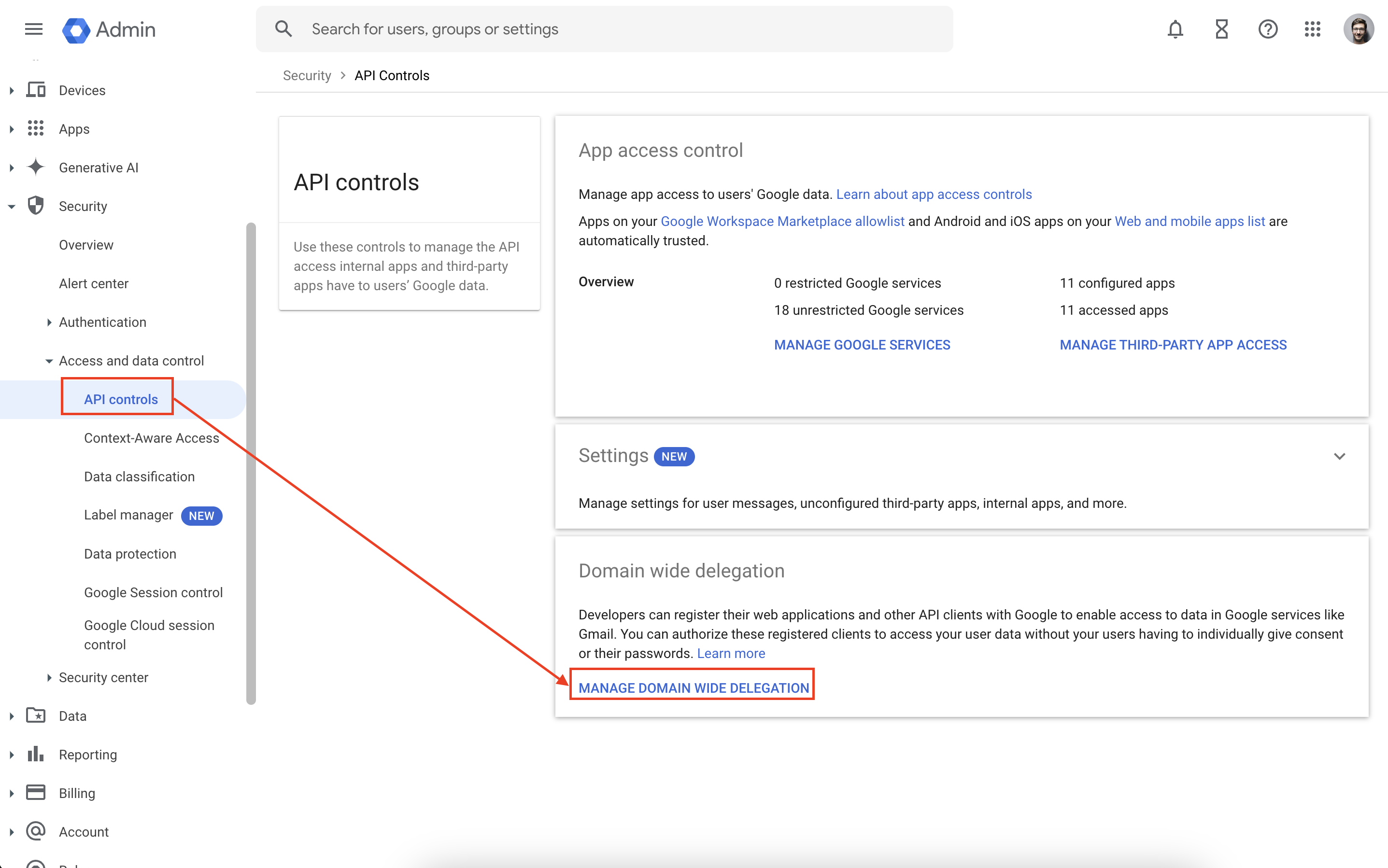 Head to your Google Workspace™ Admin Console and navigate to Security → Access and Data Control → API Controls from the left navigation panel. Upon reaching the API Controls page, click on Manage Domain Wide Delegation.