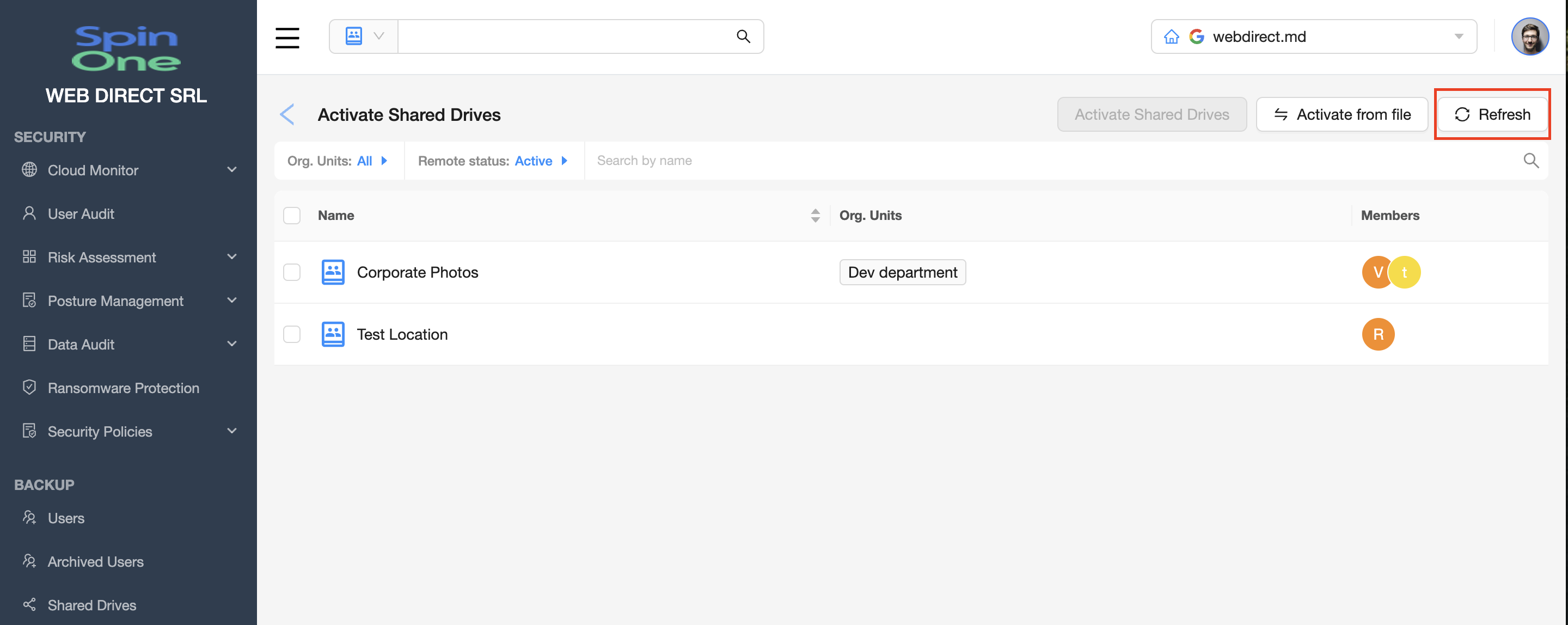 From the SpinOne platform, head to Shared Drive™/Spaces → Add new entities and click on Refresh. This will launch a manual sync to your Google Workspace™ which may take some time. Upon completion of this task, you will notice that a new service (Chats) has been added to users where their messages and conversations will be backed up, but on top of that any detected Space will be available for activation.