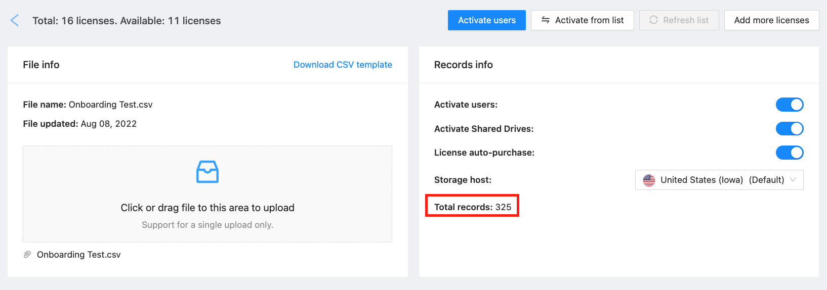 Once you’ve submitted your CSV, the SpinOne system will automatically display how many Users and/or Shared Folders will be activated.
