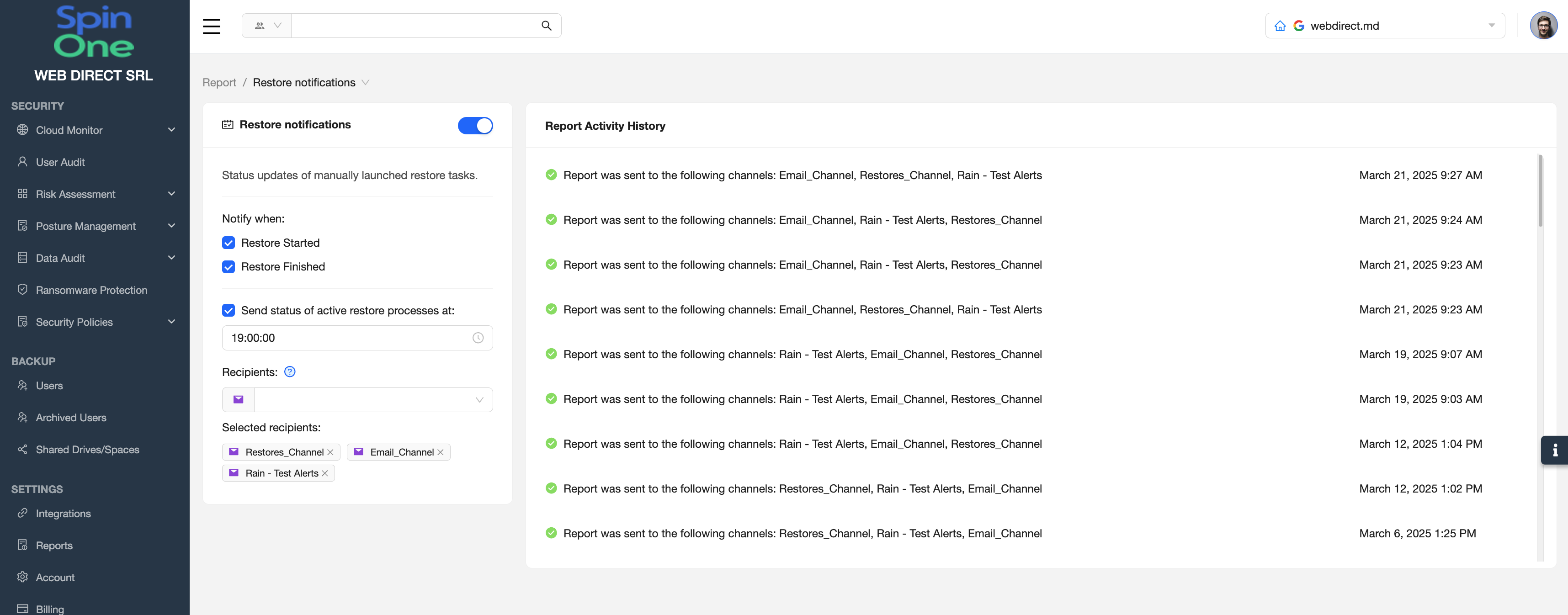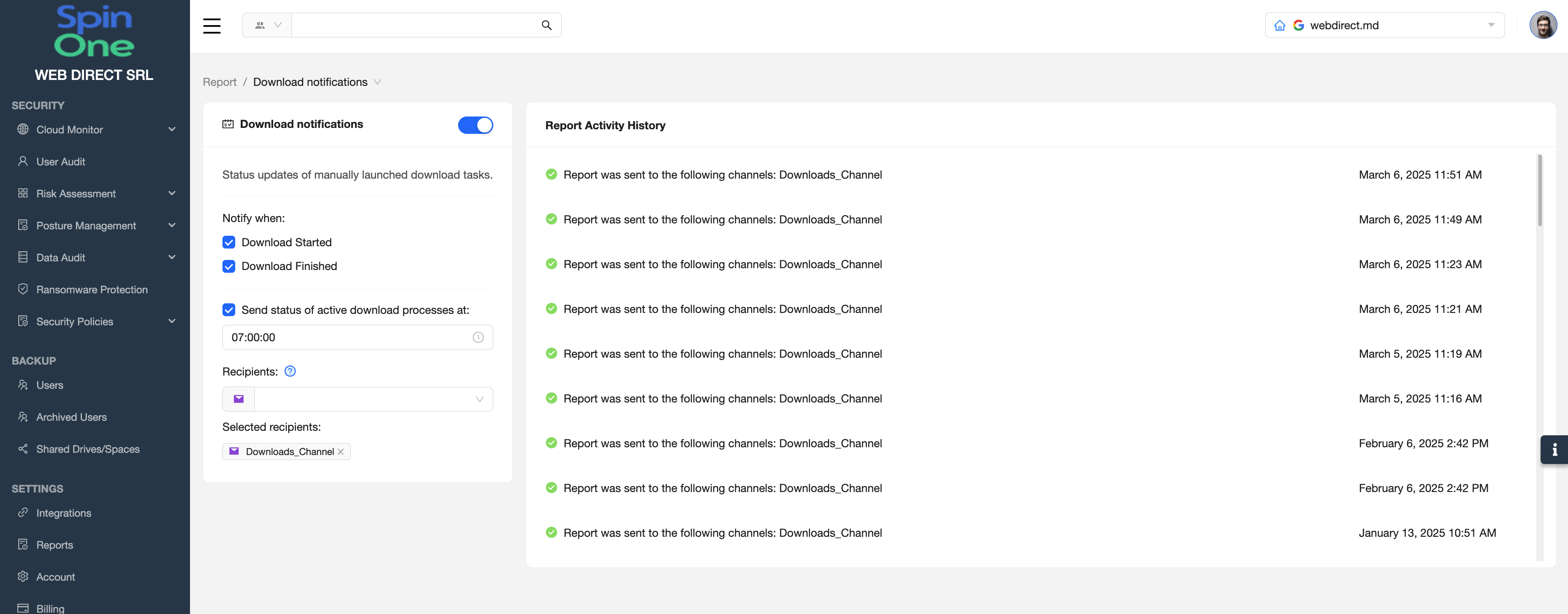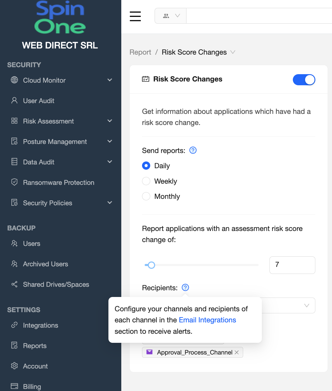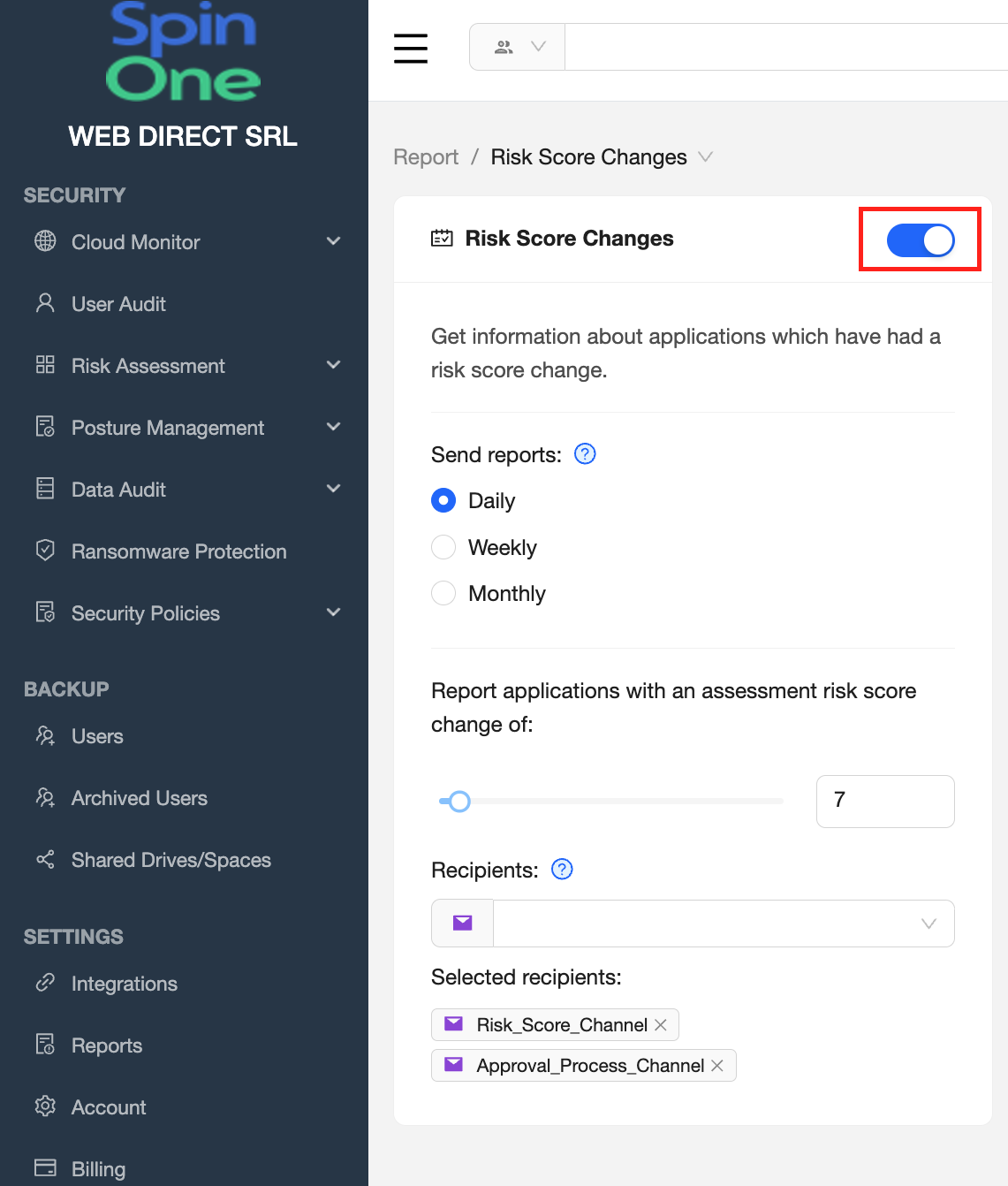 You can configure to receive Daily, Weekly or Monthly reports of all the services performed and new data detected by SpinOne. If you do not wish to receive these reports, simply select the toggle switch.
