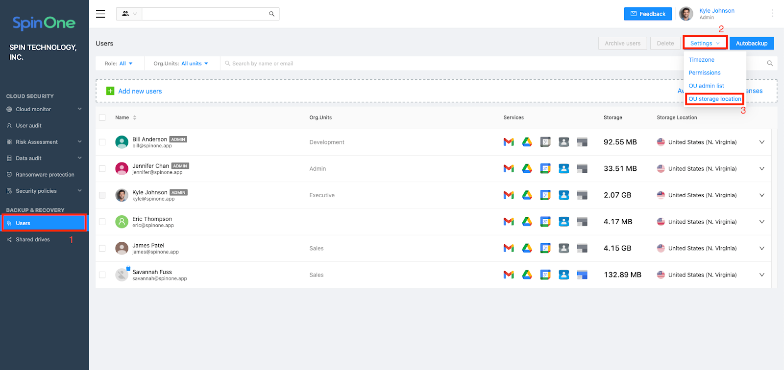 To begin setting up storage selection by OU, login to your SpinOne portal and head to the Users section from the left panel. Click on OU Storage Location under Settings.