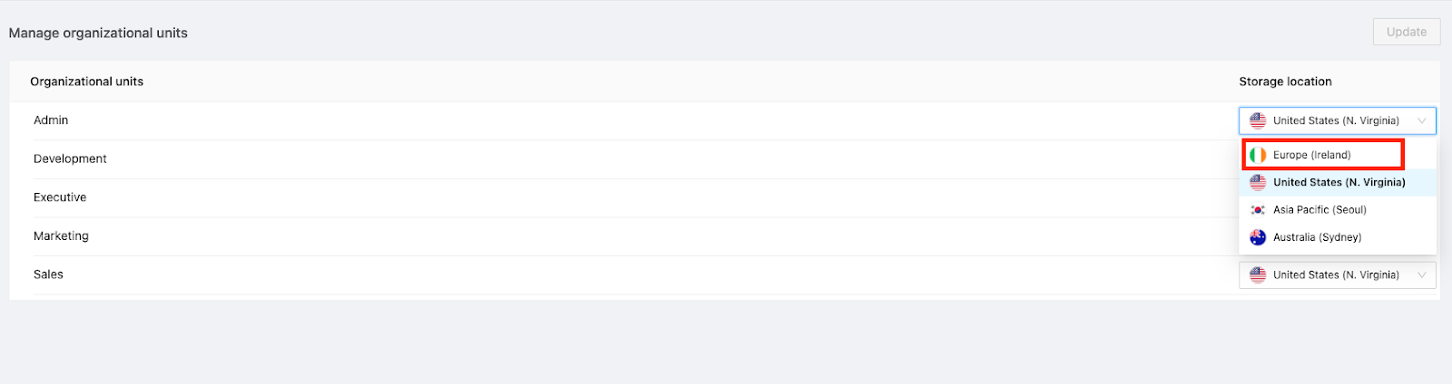 You will now see a list of your OUs imported from Google Workspace™, and their corresponding storage locations. If needed, change the storage location for any OU from this screen. The choices provided are: