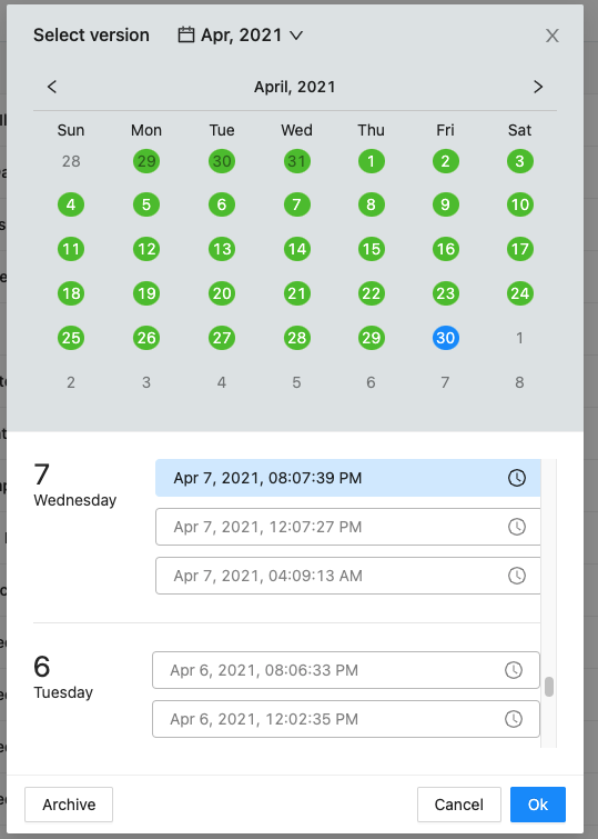 Simply select the version you are interested in, and press Ok to be able to restore or download data from what it appeared during that specific backup. You are able to revert back to the latest 100 versions for each service. In case there is data that has not been active for more than 100 versions, head to the Archive section to retrieve the data.