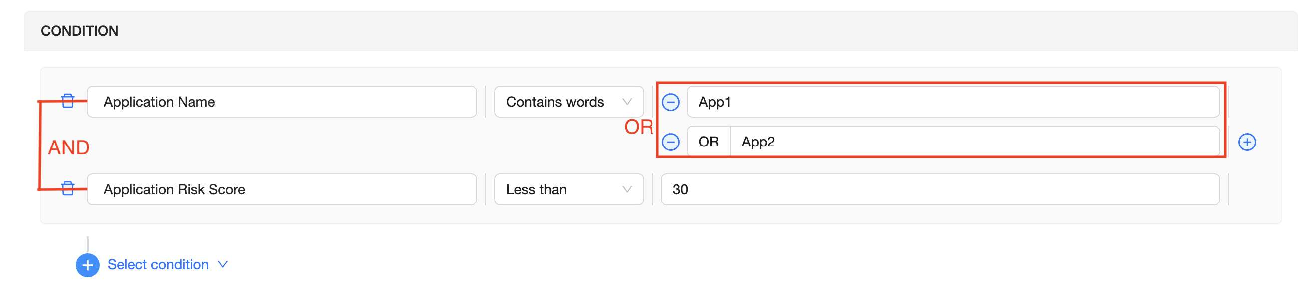 In the Condition section you will specify events that will trigger the policy. For the Application Policy type specifically, you can choose from many events such as Application Risk Score, Category, Scopes of Permissions requested, Access Last Granted and much more.