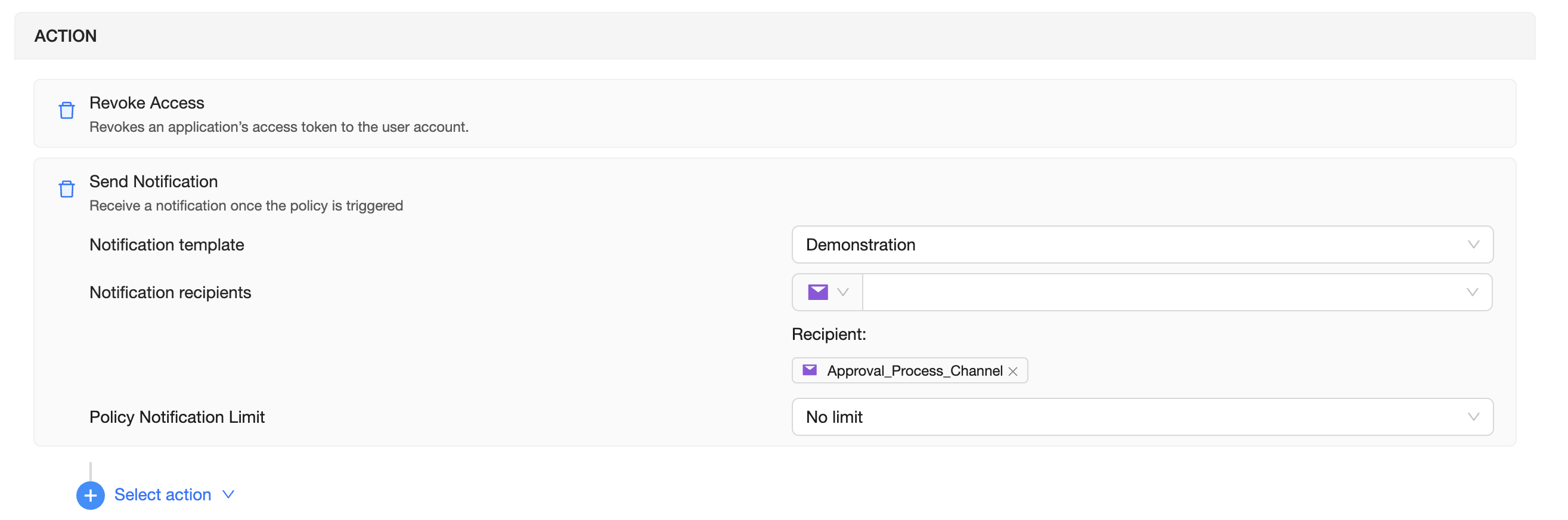 In the Action section you will specify the actions that will be taken when this policy has been triggered. For the Application Policy type specifically, you can choose from many actions such as Blocklisting/Allowlisting the application, revoking its access and much more.
