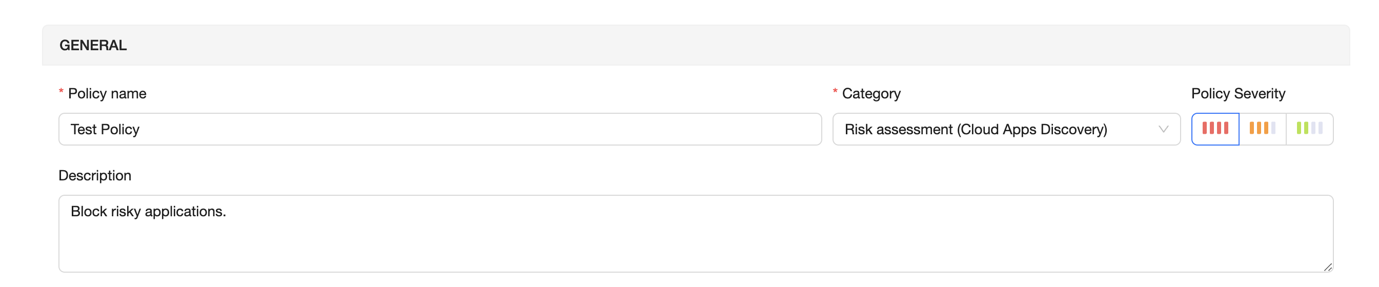 In the General section, you can fill in basic policy information such as the policy name, category, severity and a brief description of its intended purpose. This will help you to classify incidents and separate different policies from each other.