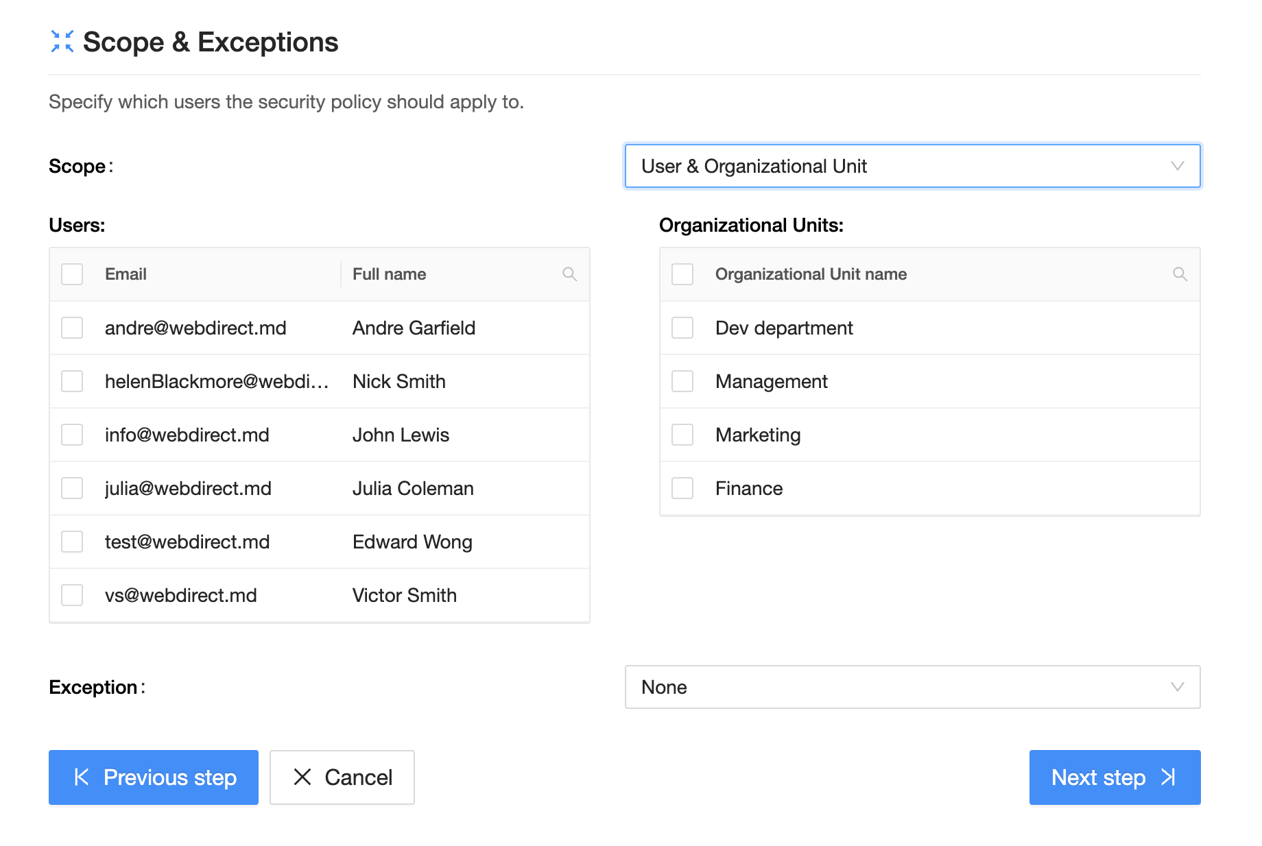 On the Scope & Exceptions page, specify for which users and groups these controls should be monitored for.