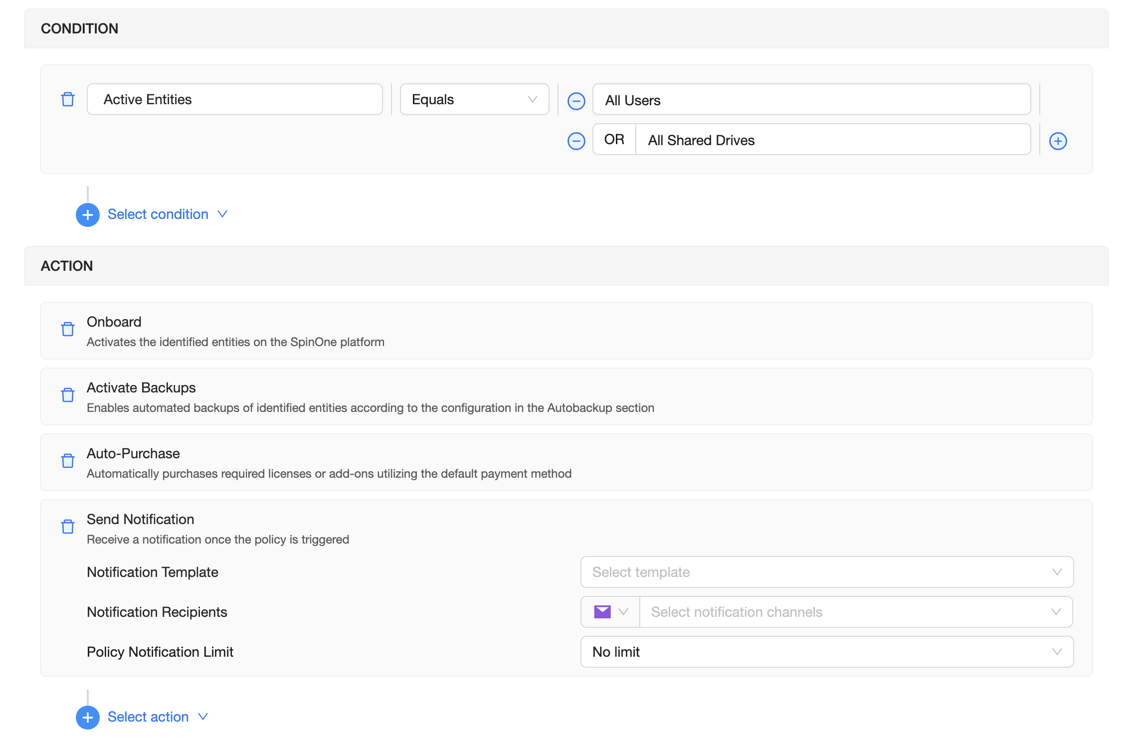 Let’s take a look at an example of the Onboarding all entities pre-built template. The goal of this policy is to: Automatically onboard all active entities from your Google Workspace™ and begin actively protecting them. In case you run out of licenses, the policy will automatically purchase them for you.