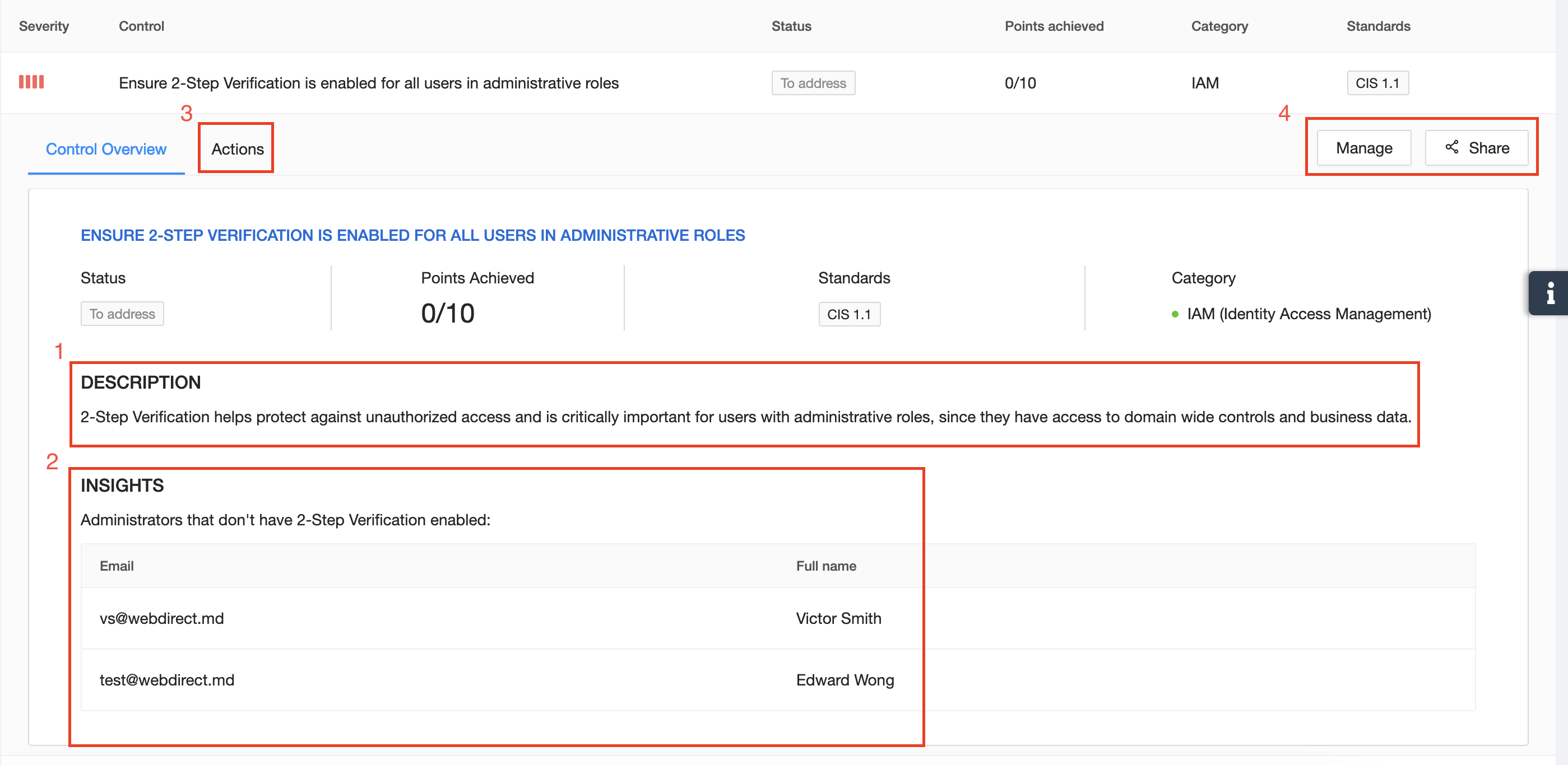 - Insights – information on assets that meet or do not meet parts of the control