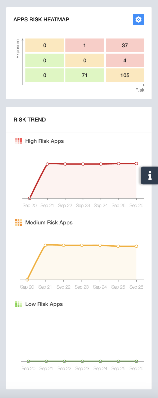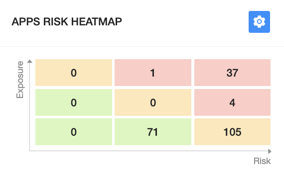 The Apps Risk Heatmap on the right hand corner is a configurable risk matrix showing Risk and Exposure. The Risk Trend on the bottom indicates number of High, Medium or Low risky applications that meet the defined factors.