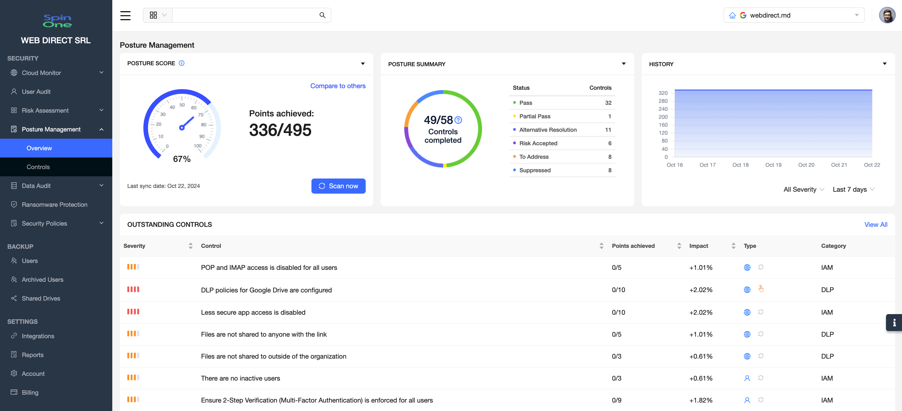 The SpinOne platform provide All-in-One SaaS Security for mission-critical applications such as Google Workspace™, Microsoft 365, Salesforce and Slack. On top of protecting the ecosystem around the SaaS application, SpinOne also helps customers improve their Security Posture by monitoring for configurations and controls of that SaaS application.