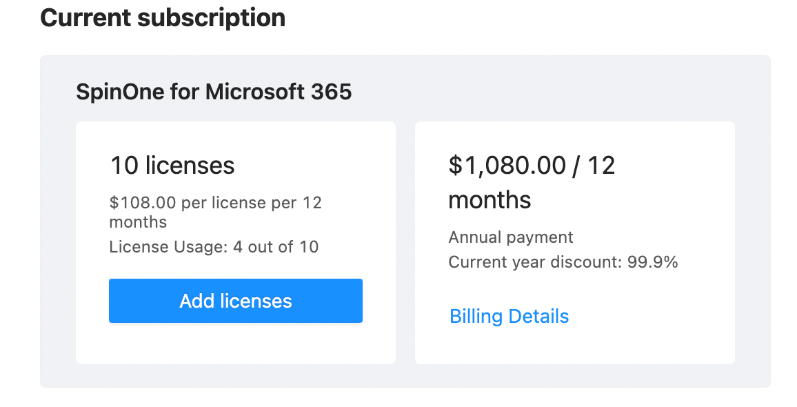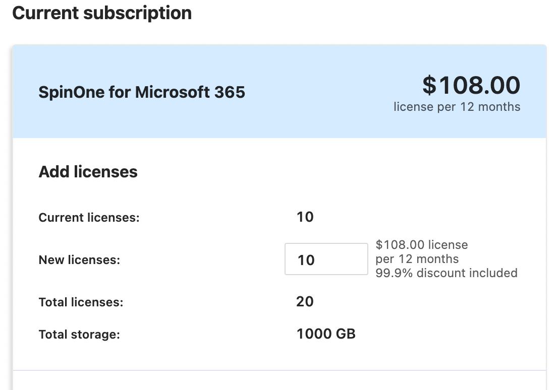 You are able to add licenses at any point of time using the SpinOne interface. Additional licenses will be pro-rated, meaning you will only be charged until the remainder of your current contract.To learn how to add licenses to your account, please follow these steps:
