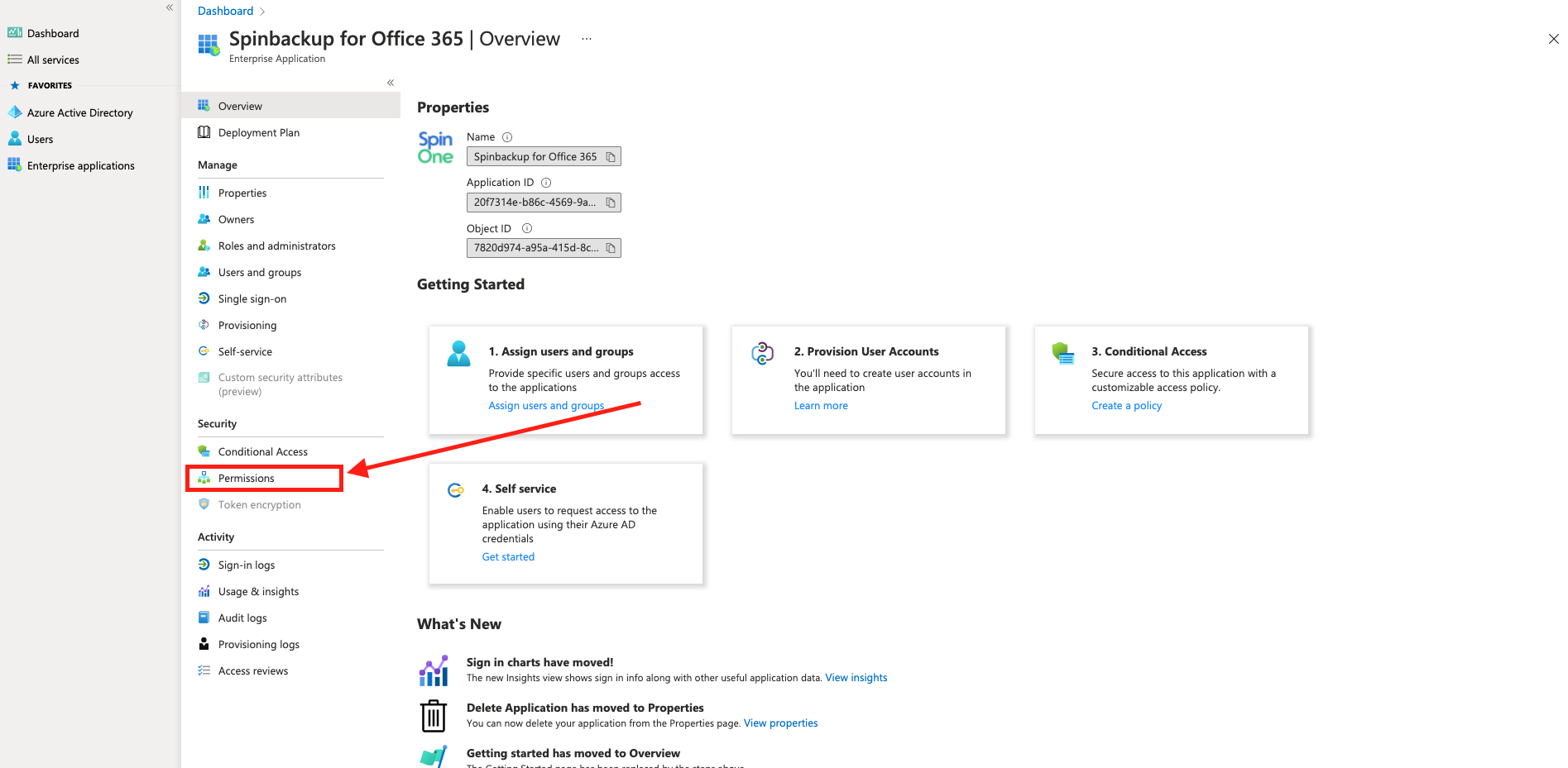 Find and open the app SpinOne (Spinbackup) for Office 365 from the application list. After opening the app, click on Permissions under the Security dropdown.