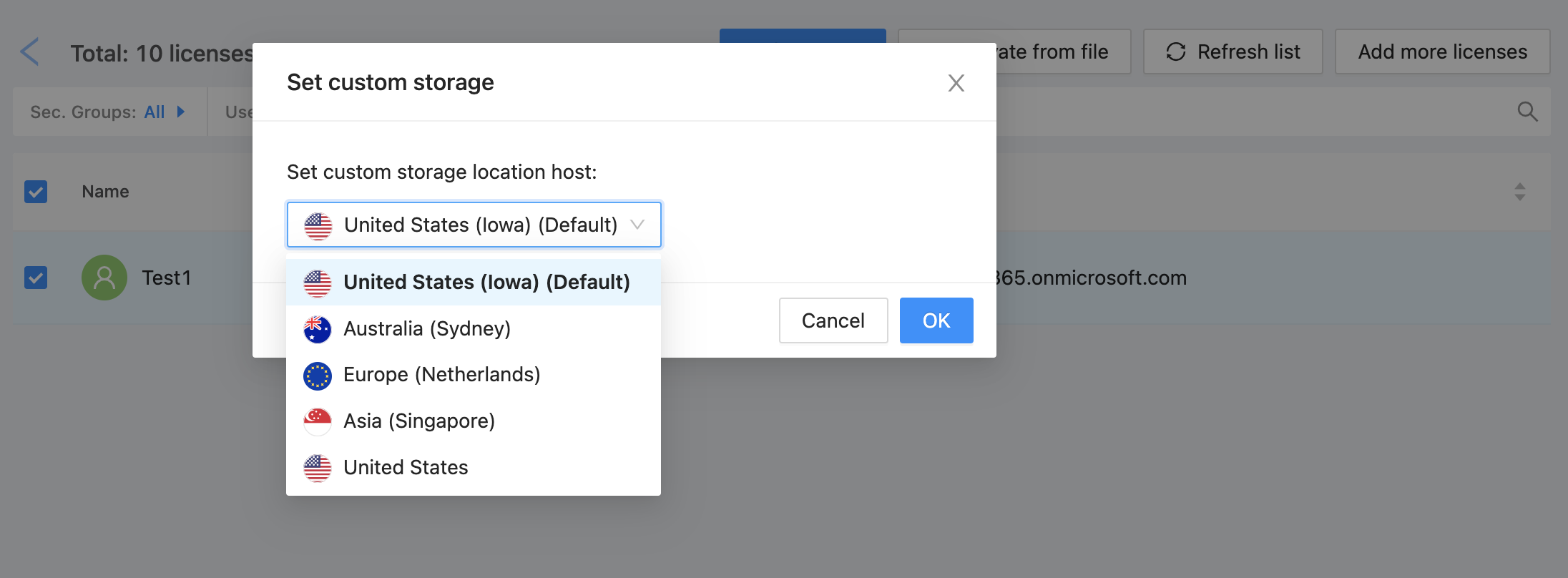 Once you select Activate users, you will be prompted to select the storage location of the newly selected entity. You can choose the default value, or choose between any of the other available regions.