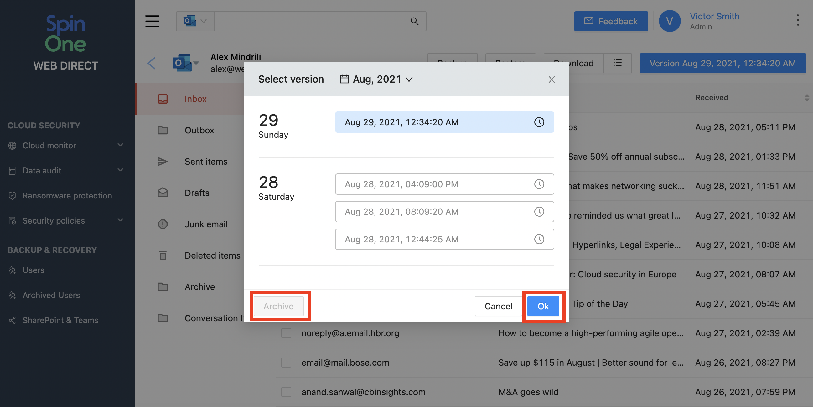 SpinOne performs automated backups of all your data for every Microsoft 365 service and a snapshot, or a Version, of your account. This is the exact state of your account as of the moment of the backup process.