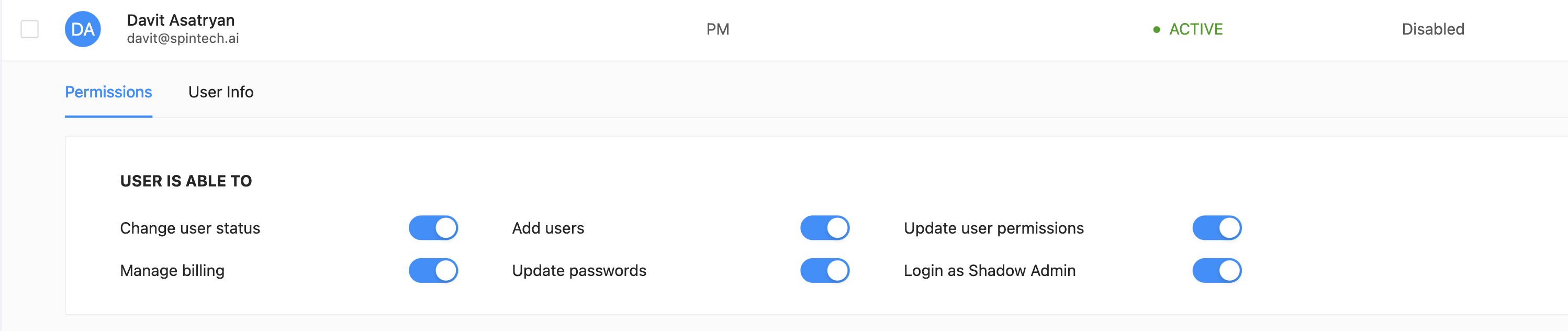 Once you login to your Partner Portal (https://partner.spin.ai/) and head to the Users section from the left panel, you’ll be able to manage permissions of existing users by simply clicking on their profile.