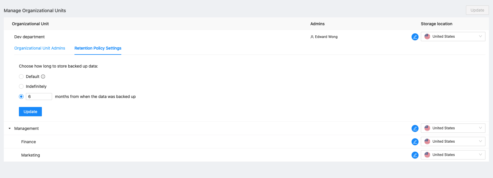 Select the retention period for the OU and click Update on the bottom to save your changes. You can follow the same steps for all other OUs.