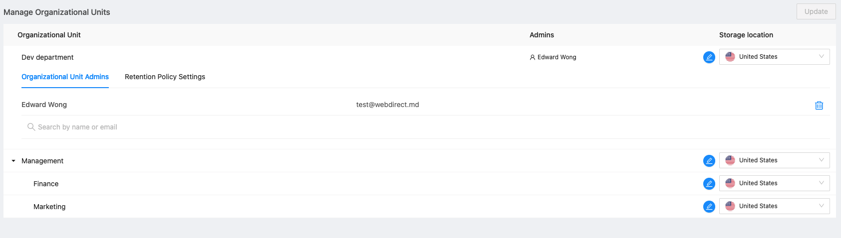 Select the retention period for the OU and click Update on the bottom to save your changes. You can follow the same steps for all other OUs.