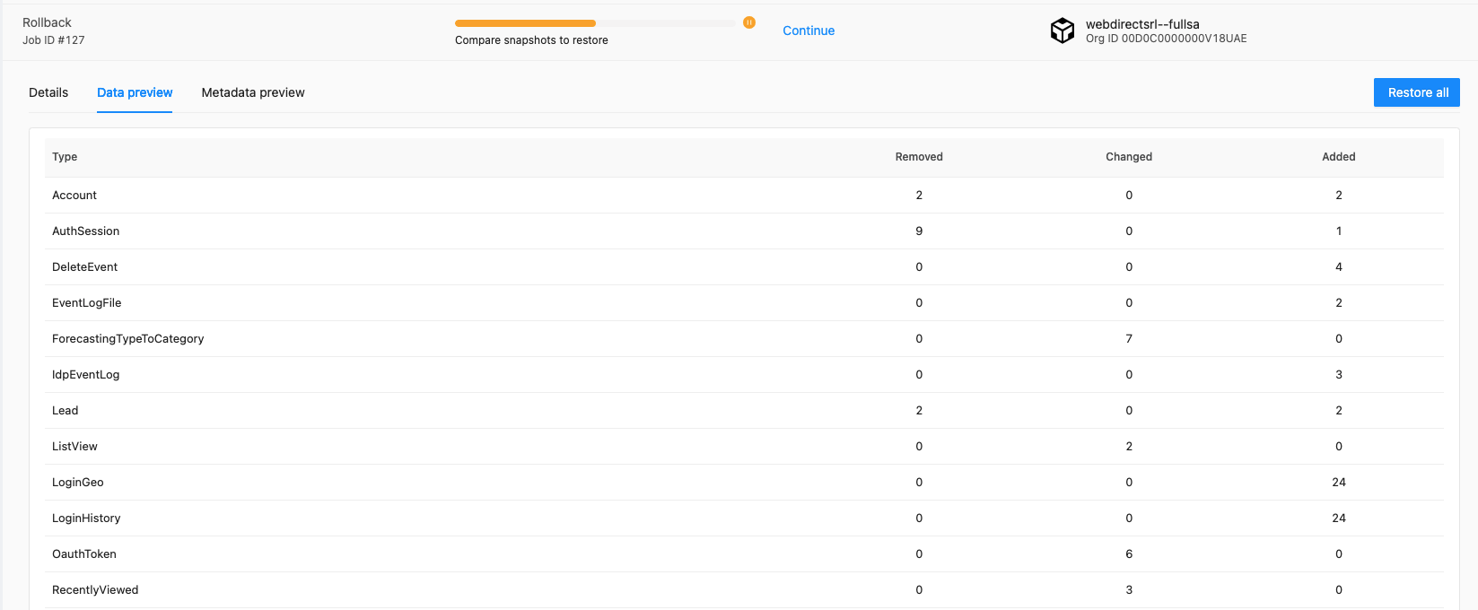 Rollback for Salesforce will allow administrators to fully revert their Salesforce environment into a previous version, simultaneously for both data and metadata. Once the task is launched, SpinOne will first compare both versions and present you with a preview of exactly how many records of each object will be restored. You can view how many records have been Removed, Changed or Added for each object.