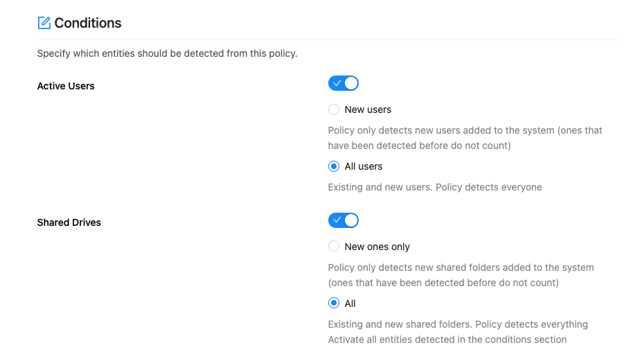 With new employees being hired and new Shared Folders being created everyday, it is imperative for organizations to ensure that their mission critical data is being protected. Create SpinOne policies that can be applied to OUs/Security Groups synced directly from your SaaS app configurations.