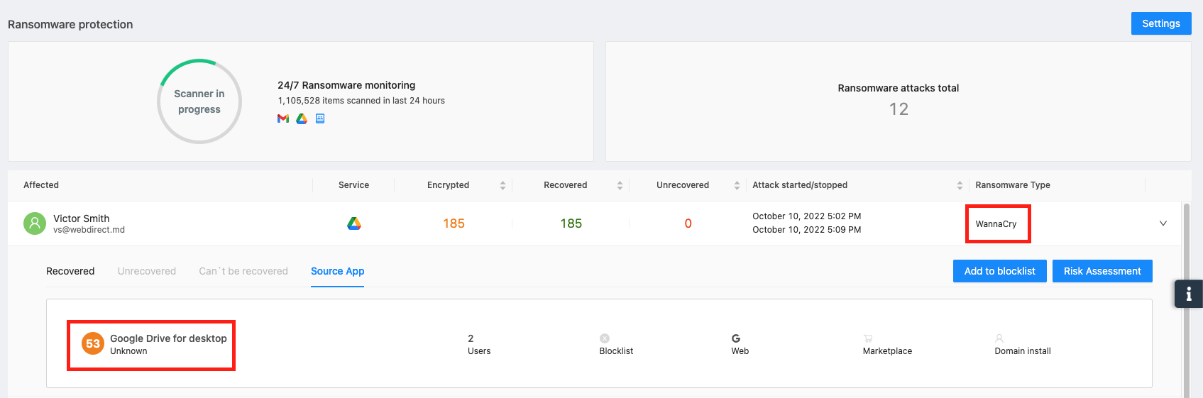 Besides automatically detecting and stopping an in progress ransomware attack, SpinOne will now also present the Type of attack that was detected on your SaaS services, along with which application was detected as the source of the spread.