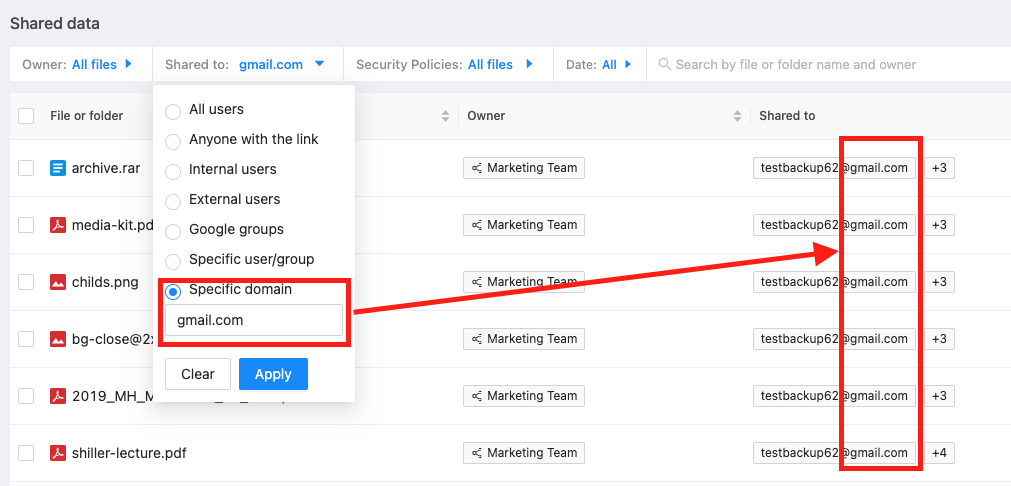 Quickly filter to all files within your organizations’ Drives shared to specific domains, and create Security Policies to automatically Revoke sharing and Alert as needed!