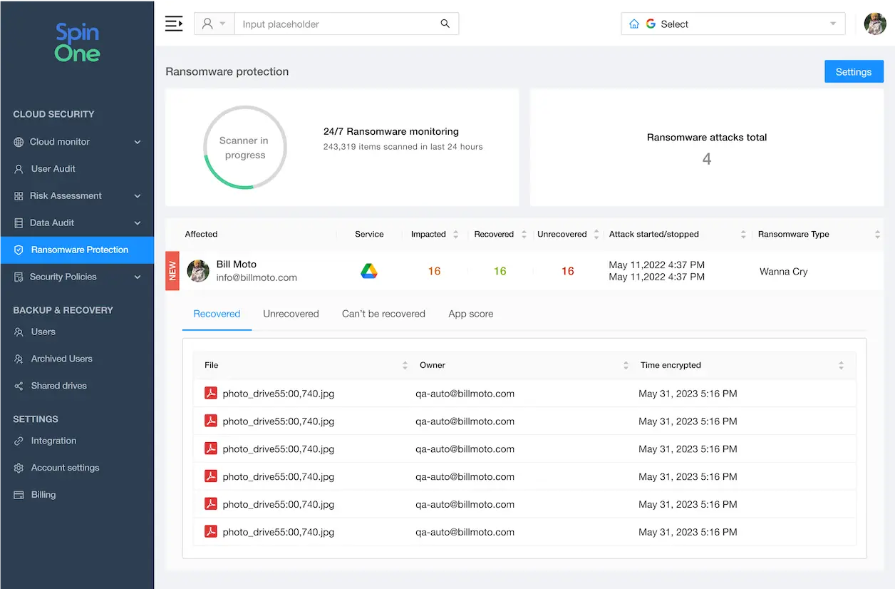 Spin.ai automates threat response protocols, which include isolating infected systems, notifying IT administrators, and initiating data recovery processes. Automation minimizes human intervention and speeds up reaction time, which is critical in mitigating the impact of ransomware.